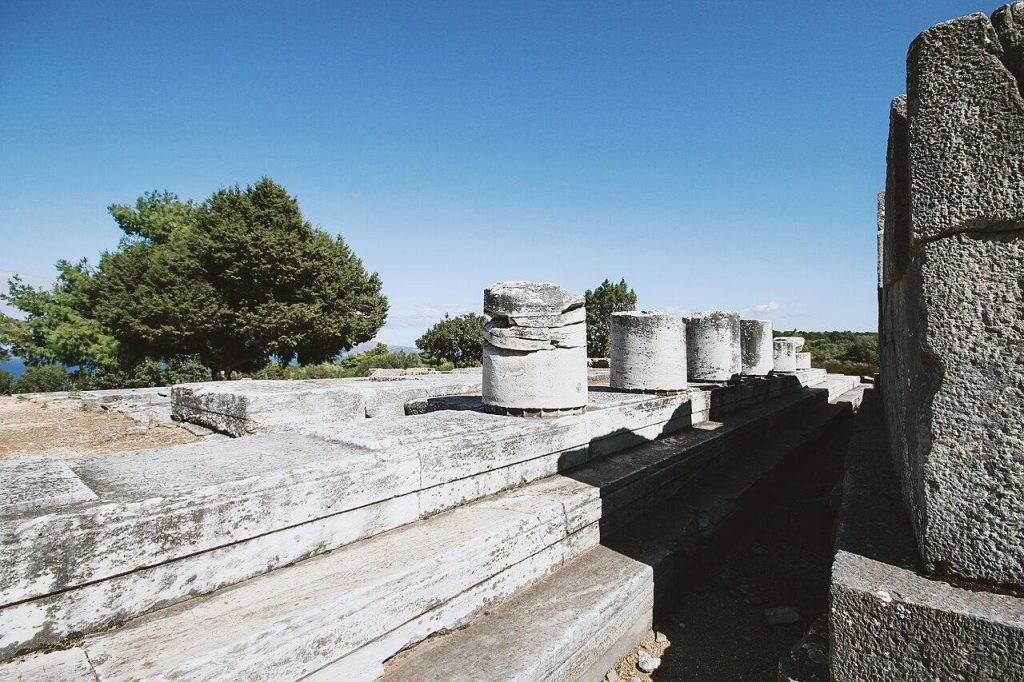 Οι δύο ναοί — της Νέμεσης και της Θέμιδας — στέκονται ακόμα, χαμηλοί αλλά επιβλητικοί, πάνω σε μια μαρμάρινη πλατφόρμα.