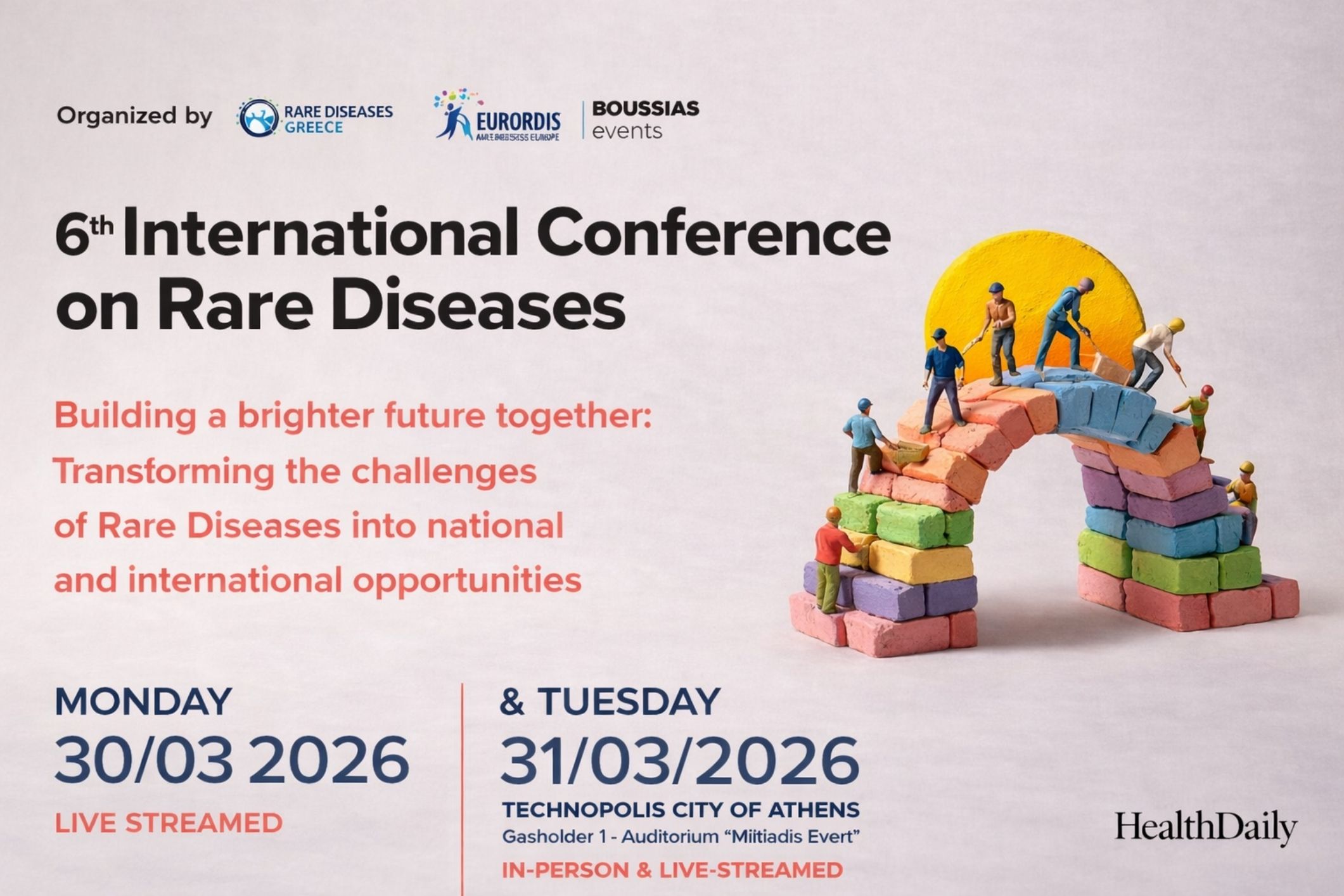 Στο πλαίσιο της φετινής Παγκόσμιας Ημέρας Σπανίων Παθήσεων, η Ένωση Σπανίων Ασθενών Ελλάδος – Ε.Σ.Α.Ε. (Rare Diseases Greece – RDG), μέλος του Ευρωπαϊκού Οργανισμού Σπανίων Παθήσεων (EURORDIS – Rare Diseases Europe), και η BOUSSIAS Events διοργανώνουν το 6ο Διεθνές Συνέδριο για τις Σπάνιες Παθήσεις (ICORD 2026), το οποίο θα πραγματοποιηθεί τη Δευτέρα 30 Μαρτίου 2026 (διαδικτυακά) και την Τρίτη 31 Μαρτίου 2026 (με φυσική παρουσία και ταυτόχρονη διαδικτυακή μετάδοση) στην ΤΕΧΝΟΠΟΛΗ Δήμου Αθηναίων, στο Αμφιθέατρο «Μιλτιάδης Έβερτ».
