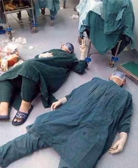 Tρεις εξαντλημένοι χειρουργοί κοιμούνται στο πάτωμα του χειρουργείου – λίγο μετά από 32 αδιάκοπες ώρες χειρουργικής επέμβασης.